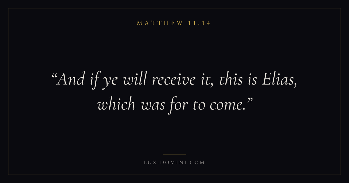 Books / Matthew / Chapter 11 / Verse 14 ← Matthew 11:13 Matthew 11:14 Matthew 11:15 → And if ye will receive it, this is Elias, which was for to come. Download verse card Share on Twitter Share on Facebook Pin it ✦ Key themes TruthFulfillmentKingdom of heavenDiscipleship Read with Matthew 11:11Matthew 11:12John 14:6John 8:32 Related topics Bible verses about truth ✦ Matthew Chapter 11 verses V. 1 V. 2 V. 3 V. 4 V. 5 V. 6 V. 7 V. 8 V. 9 V. 10 V. 11 V. 12 V. 13 V. 14 V. 15 V. 16 V. 17 V. 18 V. 19 V. 20 V. 21 V. 22 V. 23 V. 24 V. 25 V. 26 V. 27 V. 28 V. 29 V. 30