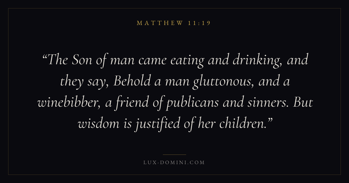 The Son of man came eating and drinking, and they say, Behold a man gluttonous, and a winebibber, a friend of publicans and sinners. But wisdom is justified of her children.
