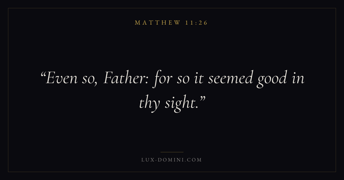 Books / Matthew / Chapter 11 / Verse 26 ← Matthew 11:25 Matthew 11:26 Matthew 11:27 → Even so, Father: for so it seemed good in thy sight. Download verse card Share on Twitter Share on Facebook Pin it ✦ Key themes FulfillmentKingdom of heavenDiscipleshipTeaching Read with Matthew 11:25Matthew 11:27 ✦ Matthew Chapter 11 verses V. 1 V. 2 V. 3 V. 4 V. 5 V. 6 V. 7 V. 8 V. 9 V. 10 V. 11 V. 12 V. 13 V. 14 V. 15 V. 16 V. 17 V. 18 V. 19 V. 20 V. 21 V. 22 V. 23 V. 24 V. 25 V. 26 V. 27 V. 28 V. 29 V. 30