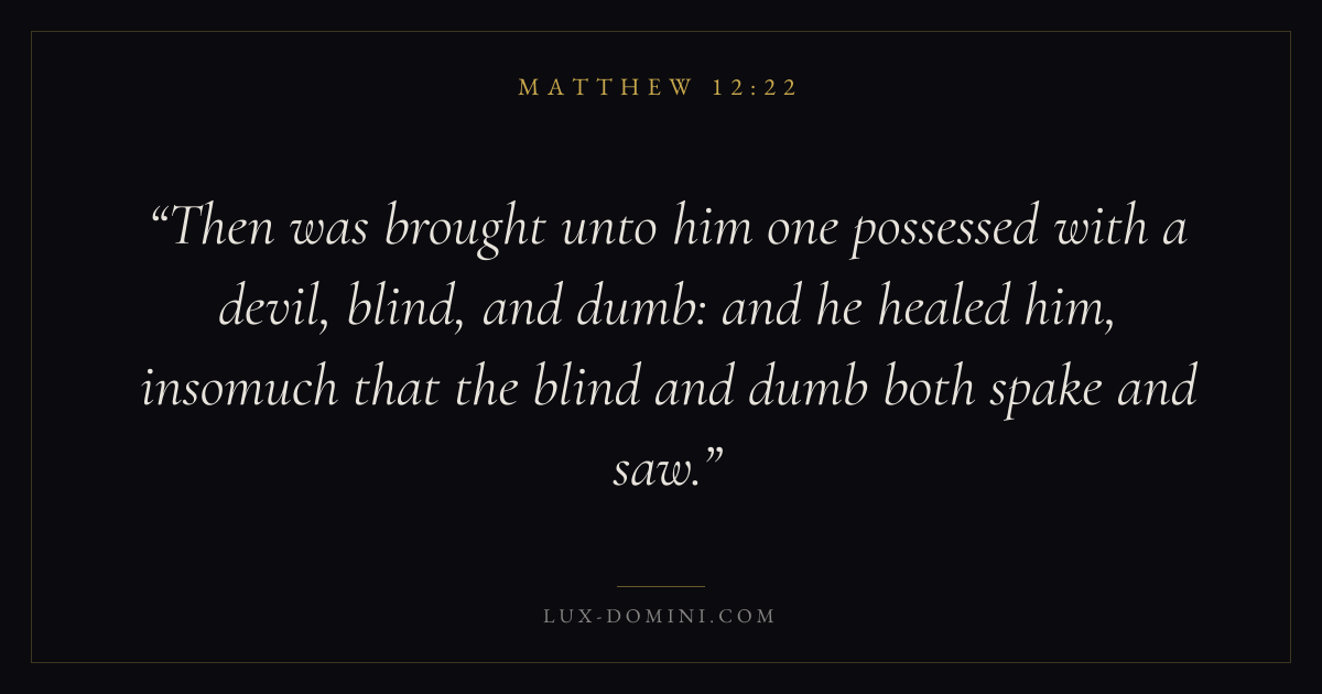 Then was brought unto him one possessed with a devil, blind, and dumb: and he healed him, insomuch that the blind and dumb both spake and saw.