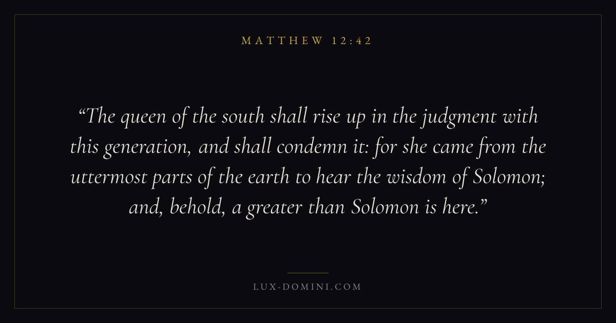 The queen of the south shall rise up in the judgment with this generation, and shall condemn it: for she came from the uttermost parts of the earth to hear the wisdom of Solomon; and, behold, a greater than Solomon is here.
