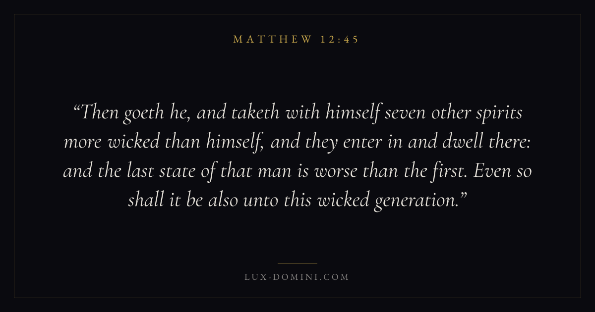 Then goeth he, and taketh with himself seven other spirits more wicked than himself, and they enter in and dwell there: and the last state of that man is worse than the first. Even so shall it be also unto this wicked generation.