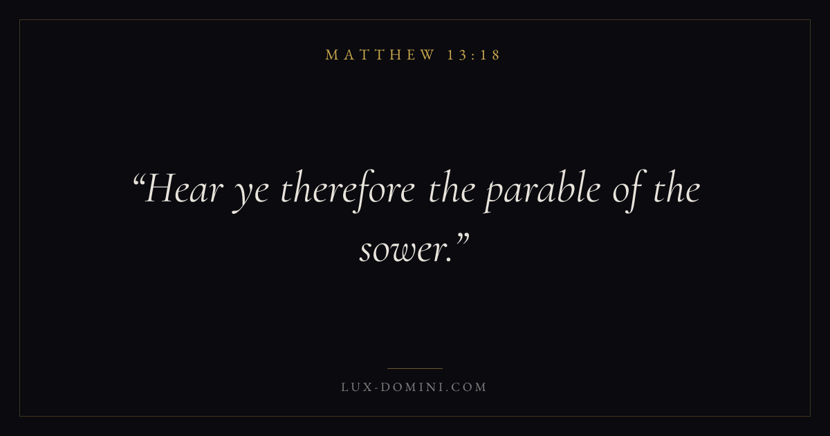Books / Matthew / Chapter 13 / Verse 18 ← Matthew 13:17 Matthew 13:18 Matthew 13:19 → Hear ye therefore the parable of the sower. Download verse card Share on Twitter Share on Facebook Pin it ✦ Key themes FulfillmentKingdom of heavenDiscipleshipTeaching Read with Matthew 13:19Matthew 13:20 ✦ Matthew Chapter 13 verses V. 1 V. 2 V. 3 V. 4 V. 5 V. 6 V. 7 V. 8 V. 9 V. 10 V. 11 V. 12 V. 13 V. 14 V. 15 V. 16 V. 17 V. 18 V. 19 V. 20 V. 21 V. 22 V. 23 V. 24 V. 25 V. 26 V. 27 V. 28 V. 29 V. 30 V. 31 V. 32 V. 33 V. 34 V. 35 V. 36 V. 37 V. 38 V. 39 V. 40 V. 41 V. 42 V. 43 V. 44 V. 45 V. 46 V. 47 V. 48 V. 49 V. 50 V. 51 V. 52 V. 53 V. 54 V. 55 V. 56 V. 57 V. 58