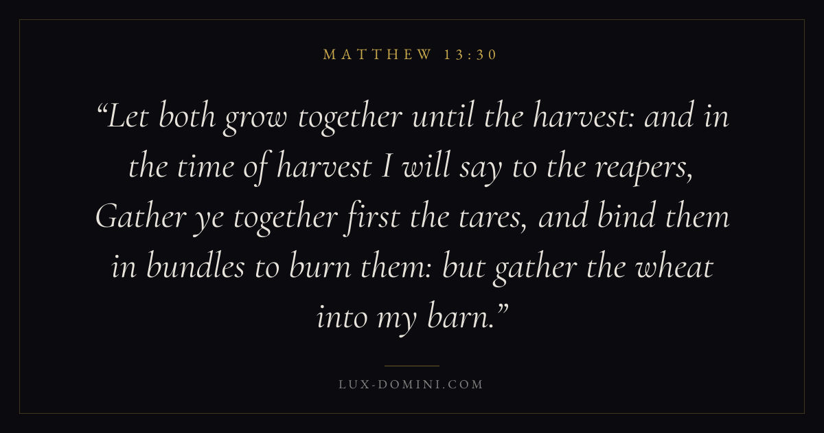 Let both grow together until the harvest: and in the time of harvest I will say to the reapers, Gather ye together first the tares, and bind them in bundles to burn them: but gather the wheat into my barn.