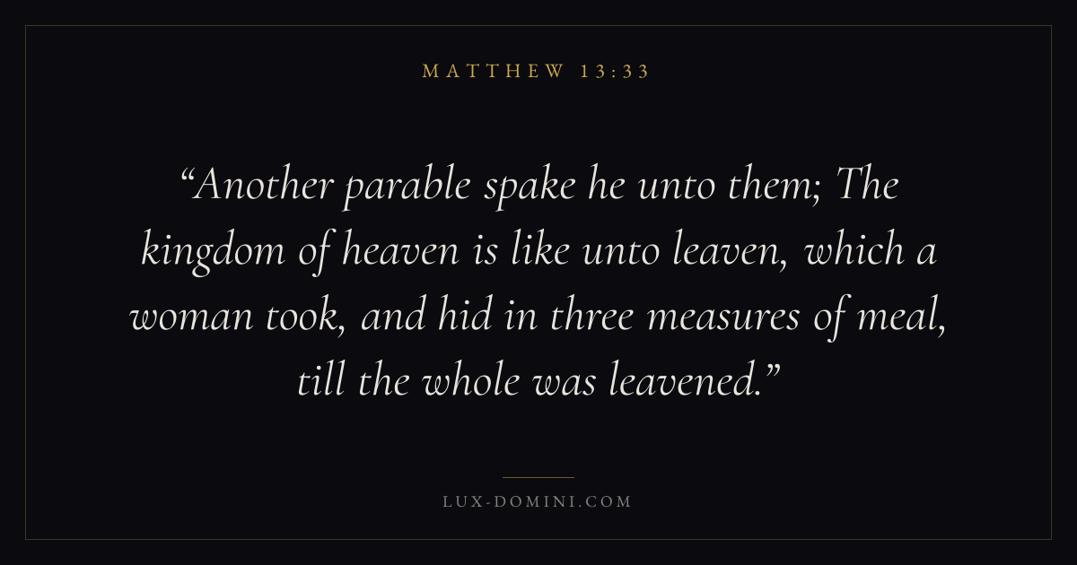Another parable spake he unto them; The kingdom of heaven is like unto leaven, which a woman took, and hid in three measures of meal, till the whole was leavened.