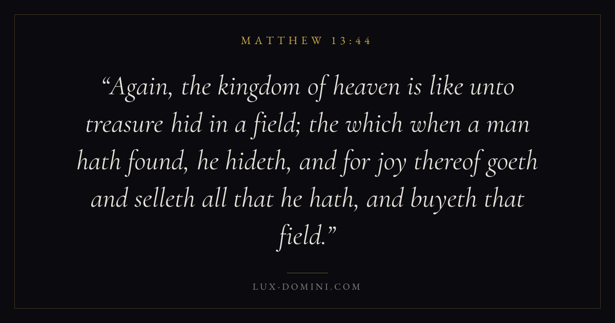 Again, the kingdom of heaven is like unto treasure hid in a field; the which when a man hath found, he hideth, and for joy thereof goeth and selleth all that he hath, and buyeth that field.