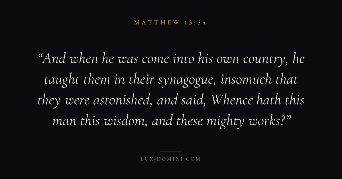 And when he was come into his own country, he taught them in their synagogue, insomuch that they were astonished, and said, Whence hath this man this wisdom, and these mighty works?