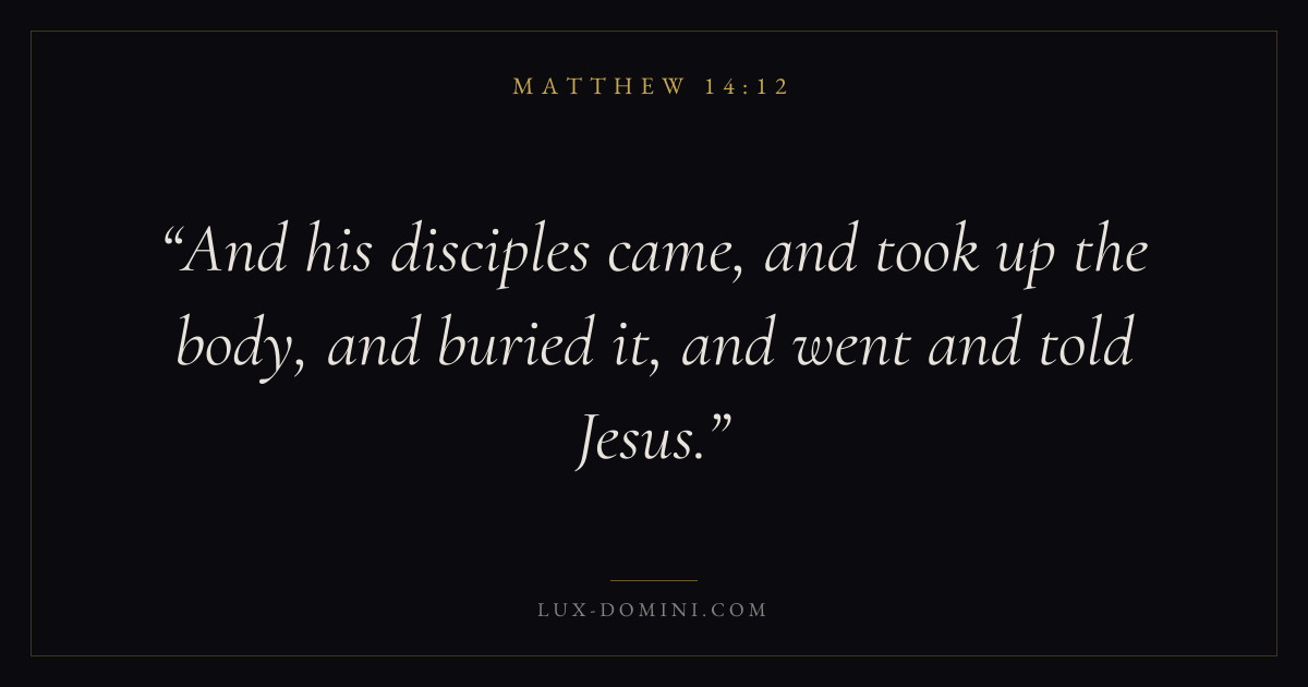 Books / Matthew / Chapter 14 / Verse 12 ← Matthew 14:11 Matthew 14:12 Matthew 14:13 → And his disciples came, and took up the body, and buried it, and went and told Jesus. Download verse card Share on Twitter Share on Facebook Pin it ✦ Key themes Anxiety and fearJustice and mercyTruthFulfillment Read with Philippians 4:6Isaiah 41:10Micah 6:8Amos 5:24 Related topics Bible verses about anxiety and fearBible verses about justice and mercyBible verses about truth ✦ Matthew Chapter 14 verses V. 1 V. 2 V. 3 V. 4 V. 5 V. 6 V. 7 V. 8 V. 9 V. 10 V. 11 V. 12 V. 13 V. 14 V. 15 V. 16 V. 17 V. 18 V. 19 V. 20 V. 21 V. 22 V. 23 V. 24 V. 25 V. 26 V. 27 V. 28 V. 29 V. 30 V. 31 V. 32 V. 33 V. 34 V. 35 V. 36