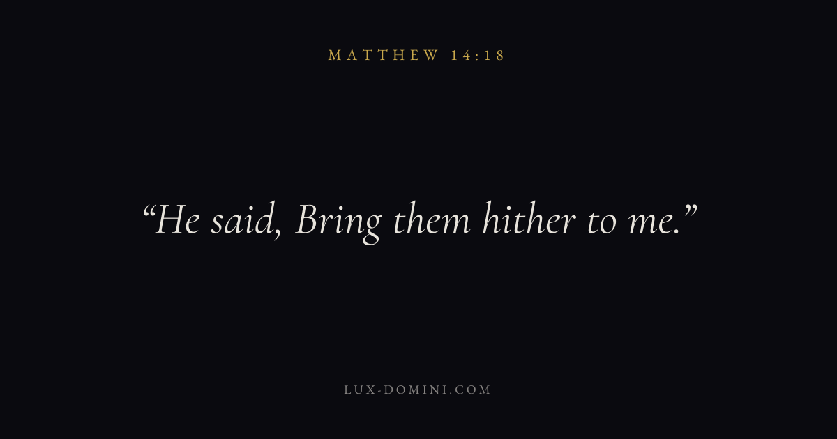 Books / Matthew / Chapter 14 / Verse 18 ← Matthew 14:17 Matthew 14:18 Matthew 14:19 → He said, Bring them hither to me. Download verse card Share on Twitter Share on Facebook Pin it ✦ Key themes GraceTruthFulfillmentKingdom of heaven Read with Matthew 14:19Matthew 14:20Ephesians 2:82 Corinthians 12:9 Related topics Bible verses about graceBible verses about truth ✦ Matthew Chapter 14 verses V. 1 V. 2 V. 3 V. 4 V. 5 V. 6 V. 7 V. 8 V. 9 V. 10 V. 11 V. 12 V. 13 V. 14 V. 15 V. 16 V. 17 V. 18 V. 19 V. 20 V. 21 V. 22 V. 23 V. 24 V. 25 V. 26 V. 27 V. 28 V. 29 V. 30 V. 31 V. 32 V. 33 V. 34 V. 35 V. 36