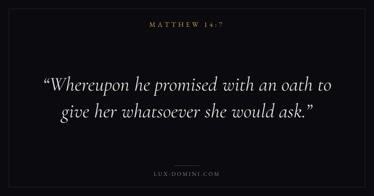 Books / Matthew / Chapter 14 / Verse 7 ← Matthew 14:6 Matthew 14:7 Matthew 14:8 → Whereupon he promised with an oath to give her whatsoever she would ask. Download verse card Share on Twitter Share on Facebook Pin it ✦ Key themes HopeAnxiety and fearPrayerJustice and mercyFulfillment Read with Matthew 14:8Matthew 14:9Romans 8:24Revelation 21:4 Related topics Bible verses about hopeBible verses about anxiety and fearBible verses about prayerBible verses about justice and mercy ✦ Matthew Chapter 14 verses V. 1 V. 2 V. 3 V. 4 V. 5 V. 6 V. 7 V. 8 V. 9 V. 10 V. 11 V. 12 V. 13 V. 14 V. 15 V. 16 V. 17 V. 18 V. 19 V. 20 V. 21 V. 22 V. 23 V. 24 V. 25 V. 26 V. 27 V. 28 V. 29 V. 30 V. 31 V. 32 V. 33 V. 34 V. 35 V. 36