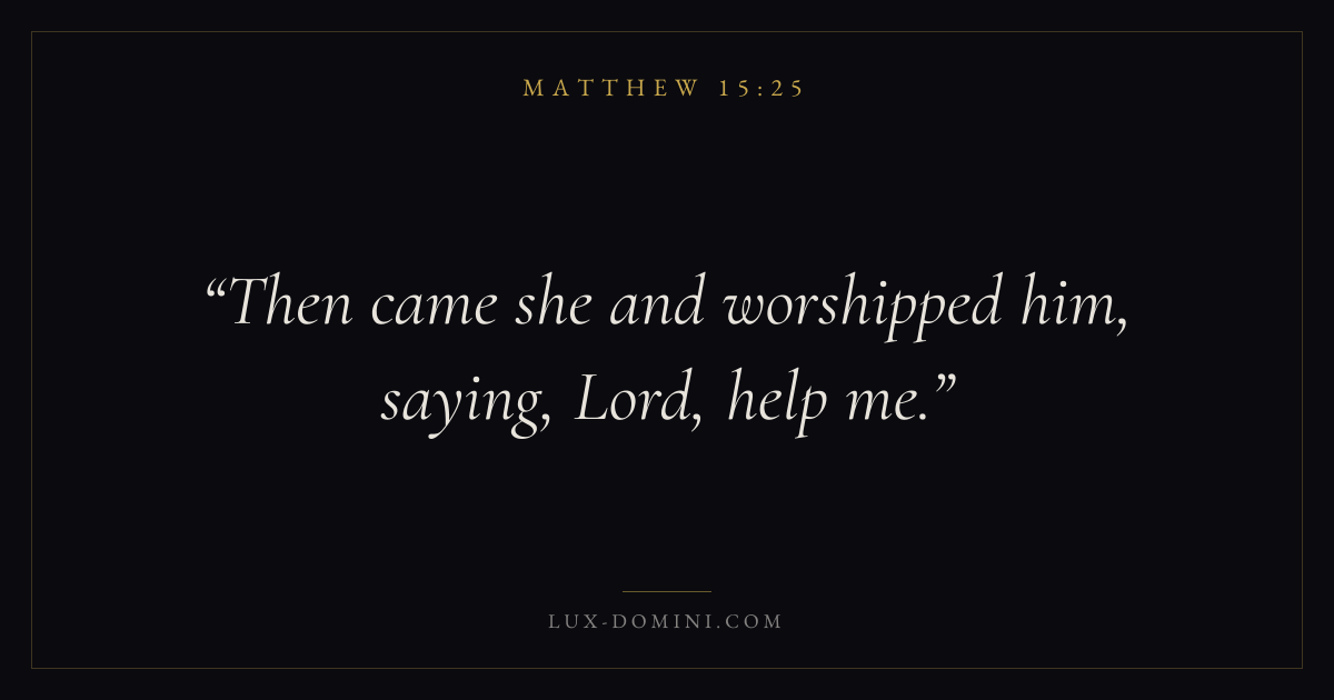Books / Matthew / Chapter 15 / Verse 25 ← Matthew 15:24 Matthew 15:25 Matthew 15:26 → Then came she and worshipped him, saying, Lord, help me. Download verse card Share on Twitter Share on Facebook Pin it ✦ Key themes SalvationFulfillmentKingdom of heavenDiscipleship Read with Matthew 15:21Matthew 15:22John 3:16Ephesians 2:8 Related topics Bible verses about salvation ✦ Matthew Chapter 15 verses V. 1 V. 2 V. 3 V. 4 V. 5 V. 6 V. 7 V. 8 V. 9 V. 10 V. 11 V. 12 V. 13 V. 14 V. 15 V. 16 V. 17 V. 18 V. 19 V. 20 V. 21 V. 22 V. 23 V. 24 V. 25 V. 26 V. 27 V. 28 V. 29 V. 30 V. 31 V. 32 V. 33 V. 34 V. 35 V. 36 V. 37 V. 38 V. 39