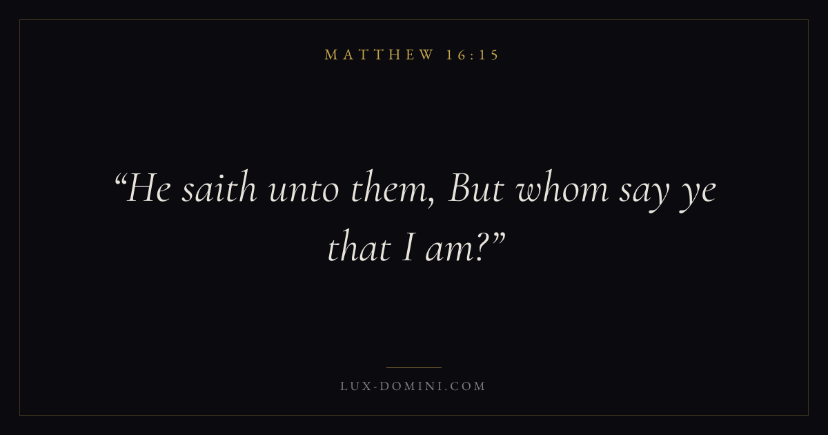 Books / Matthew / Chapter 16 / Verse 15 ← Matthew 16:14 Matthew 16:15 Matthew 16:16 → He saith unto them, But whom say ye that I am? Download verse card Share on Twitter Share on Facebook Pin it ✦ Key themes HopeFulfillmentKingdom of heavenDiscipleship Read with Matthew 16:16Matthew 16:17Romans 8:24Revelation 21:4 Related topics Bible verses about hope ✦ Matthew Chapter 16 verses V. 1 V. 2 V. 3 V. 4 V. 5 V. 6 V. 7 V. 8 V. 9 V. 10 V. 11 V. 12 V. 13 V. 14 V. 15 V. 16 V. 17 V. 18 V. 19 V. 20 V. 21 V. 22 V. 23 V. 24 V. 25 V. 26 V. 27 V. 28