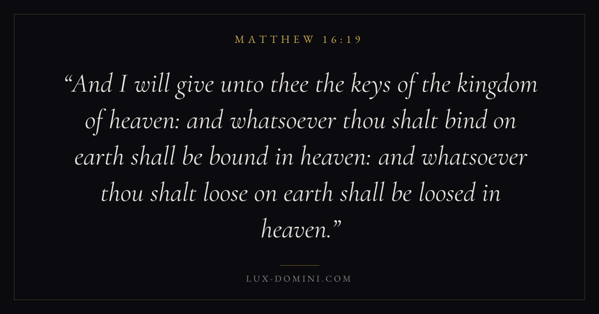 And I will give unto thee the keys of the kingdom of heaven: and whatsoever thou shalt bind on earth shall be bound in heaven: and whatsoever thou shalt loose on earth shall be loosed in heaven.