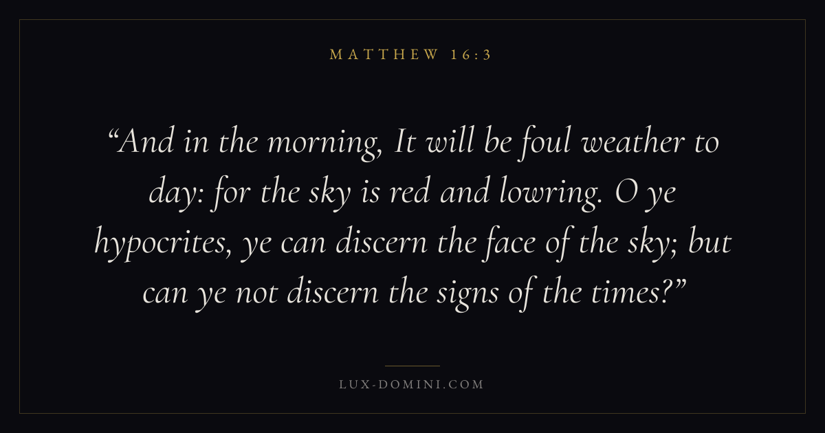 And in the morning, It will be foul weather to day: for the sky is red and lowring. O ye hypocrites, ye can discern the face of the sky; but can ye not discern the signs of the times?