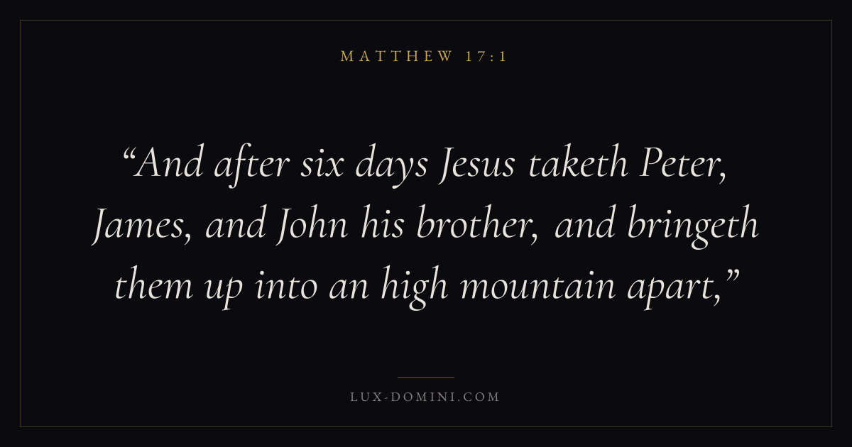 And after six days Jesus taketh Peter, James, and John his brother, and bringeth them up into an high mountain apart,