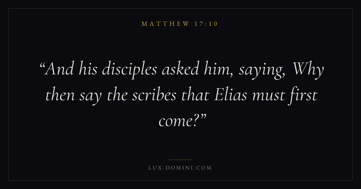Books / Matthew / Chapter 17 / Verse 10 ← Matthew 17:9 Matthew 17:10 Matthew 17:11 → And his disciples asked him, saying, Why then say the scribes that Elias must first come? Download verse card Share on Twitter Share on Facebook Pin it ✦ Key themes FaithPrayerTruthFulfillment Read with Matthew 17:11Matthew 17:12Hebrews 11:1Romans 10:17 Related topics Bible verses about faithBible verses about prayerBible verses about truth ✦ Matthew Chapter 17 verses V. 1 V. 2 V. 3 V. 4 V. 5 V. 6 V. 7 V. 8 V. 9 V. 10 V. 11 V. 12 V. 13 V. 14 V. 15 V. 16 V. 17 V. 18 V. 19 V. 20 V. 21 V. 22 V. 23 V. 24 V. 25 V. 26 V. 27