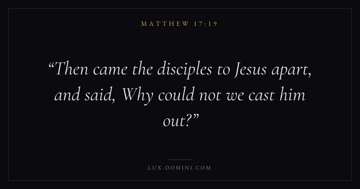 Books / Matthew / Chapter 17 / Verse 19 ← Matthew 17:18 Matthew 17:19 Matthew 17:20 → Then came the disciples to Jesus apart, and said, Why could not we cast him out? Download verse card Share on Twitter Share on Facebook Pin it ✦ Key themes Suffering and trialsPrayerFulfillmentKingdom of heaven Read with Matthew 17:20Matthew 17:21Romans 8:182 Corinthians 4:17 Related topics Bible verses about suffering and trialsBible verses about prayer ✦ Matthew Chapter 17 verses V. 1 V. 2 V. 3 V. 4 V. 5 V. 6 V. 7 V. 8 V. 9 V. 10 V. 11 V. 12 V. 13 V. 14 V. 15 V. 16 V. 17 V. 18 V. 19 V. 20 V. 21 V. 22 V. 23 V. 24 V. 25 V. 26 V. 27