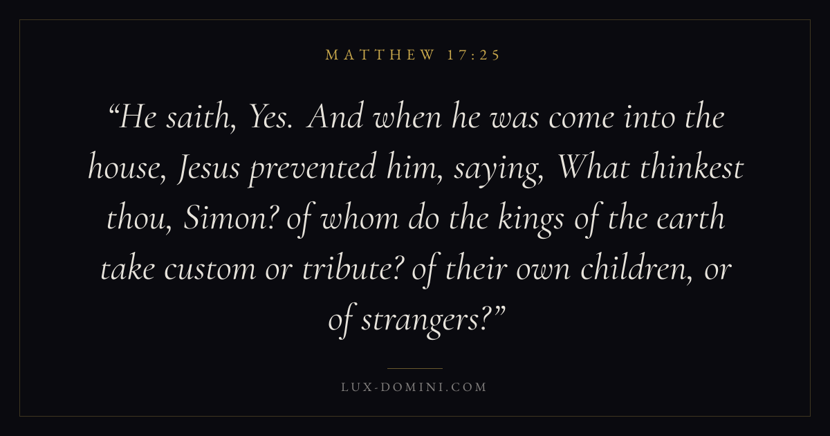 He saith, Yes. And when he was come into the house, Jesus prevented him, saying, What thinkest thou, Simon? of whom do the kings of the earth take custom or tribute? of their own children, or of strangers?