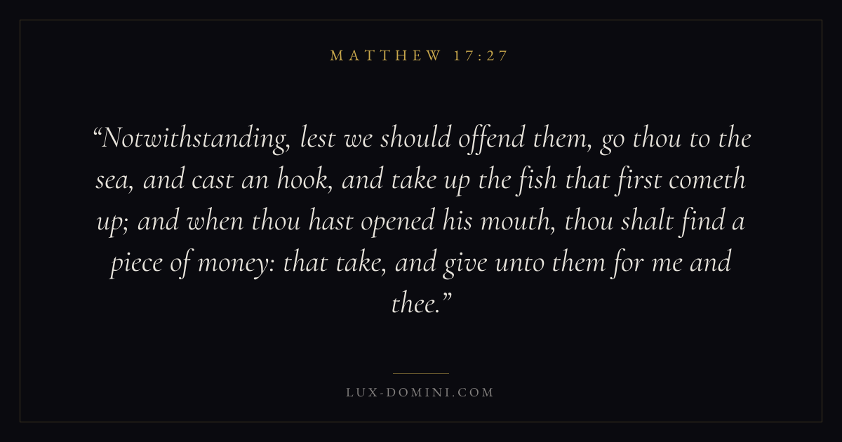 Notwithstanding, lest we should offend them, go thou to the sea, and cast an hook, and take up the fish that first cometh up; and when thou hast opened his mouth, thou shalt find a piece of money: that take, and give unto them for me and thee.