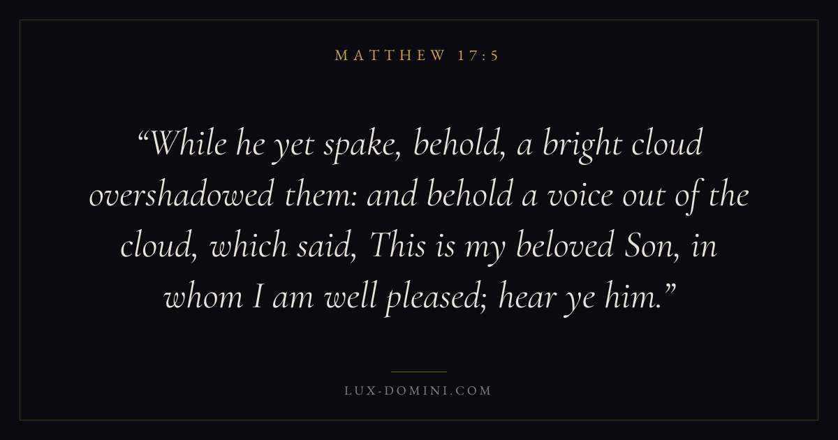 While he yet spake, behold, a bright cloud overshadowed them: and behold a voice out of the cloud, which said, This is my beloved Son, in whom I am well pleased; hear ye him.