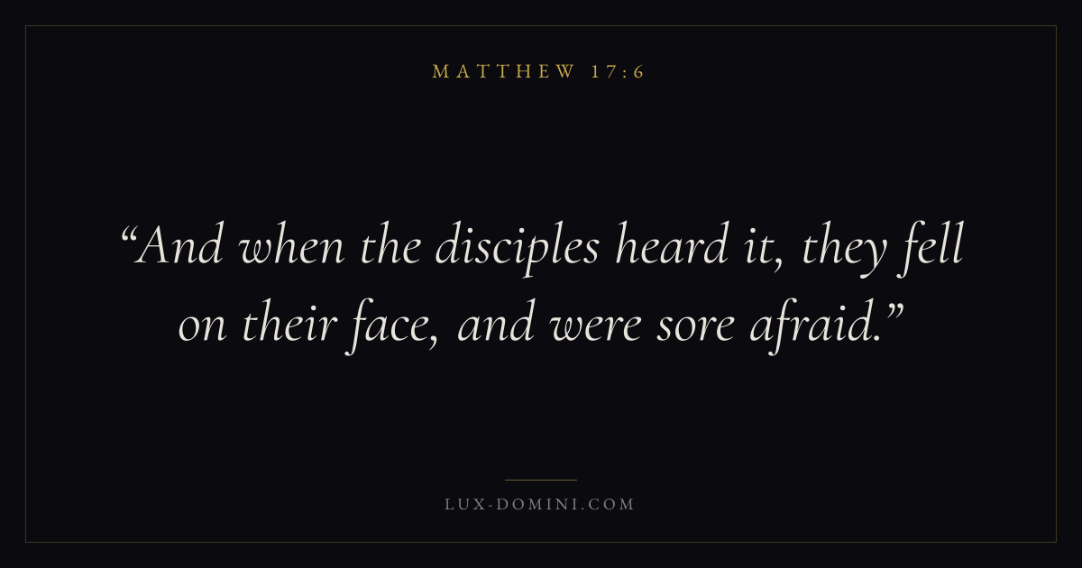 Books / Matthew / Chapter 17 / Verse 6 ← Matthew 17:5 Matthew 17:6 Matthew 17:7 → And when the disciples heard it, they fell on their face, and were sore afraid. Download verse card Share on Twitter Share on Facebook Pin it ✦ Key themes FaithAnxiety and fearTruthFulfillment Read with Matthew 17:5Matthew 17:7Hebrews 11:1Romans 10:17 Related topics Bible verses about faithBible verses about anxiety and fearBible verses about truth ✦ Matthew Chapter 17 verses V. 1 V. 2 V. 3 V. 4 V. 5 V. 6 V. 7 V. 8 V. 9 V. 10 V. 11 V. 12 V. 13 V. 14 V. 15 V. 16 V. 17 V. 18 V. 19 V. 20 V. 21 V. 22 V. 23 V. 24 V. 25 V. 26 V. 27