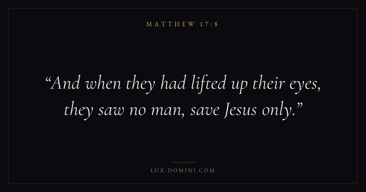 Books / Matthew / Chapter 17 / Verse 8 ← Matthew 17:7 Matthew 17:8 Matthew 17:9 → And when they had lifted up their eyes, they saw no man, save Jesus only. Download verse card Share on Twitter Share on Facebook Pin it ✦ Key themes FaithSalvationTruthFulfillment Read with Matthew 17:5Matthew 17:6Hebrews 11:1Romans 10:17 Related topics Bible verses about faithBible verses about salvationBible verses about truth ✦ Matthew Chapter 17 verses V. 1 V. 2 V. 3 V. 4 V. 5 V. 6 V. 7 V. 8 V. 9 V. 10 V. 11 V. 12 V. 13 V. 14 V. 15 V. 16 V. 17 V. 18 V. 19 V. 20 V. 21 V. 22 V. 23 V. 24 V. 25 V. 26 V. 27