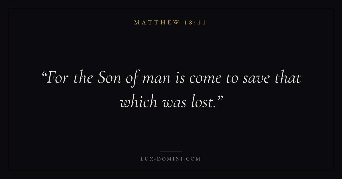 Books / Matthew / Chapter 18 / Verse 11 ← Matthew 18:10 Matthew 18:11 Matthew 18:12 → For the Son of man is come to save that which was lost. Download verse card Share on Twitter Share on Facebook Pin it ✦ Key themes WisdomSalvationFulfillmentKingdom of heaven Read with Matthew 18:10Proverbs 1:7James 1:5John 3:16 Related topics Bible verses about wisdomBible verses about salvation ✦ Matthew Chapter 18 verses V. 1 V. 2 V. 3 V. 4 V. 5 V. 6 V. 7 V. 8 V. 9 V. 10 V. 11 V. 12 V. 13 V. 14 V. 15 V. 16 V. 17 V. 18 V. 19 V. 20 V. 21 V. 22 V. 23 V. 24 V. 25 V. 26 V. 27 V. 28 V. 29 V. 30 V. 31 V. 32 V. 33 V. 34 V. 35
