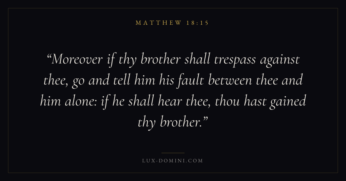 Moreover if thy brother shall trespass against thee, go and tell him his fault between thee and him alone: if he shall hear thee, thou hast gained thy brother.