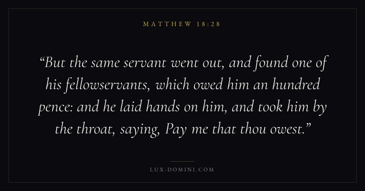 But the same servant went out, and found one of his fellowservants, which owed him an hundred pence: and he laid hands on him, and took him by the throat, saying, Pay me that thou owest.