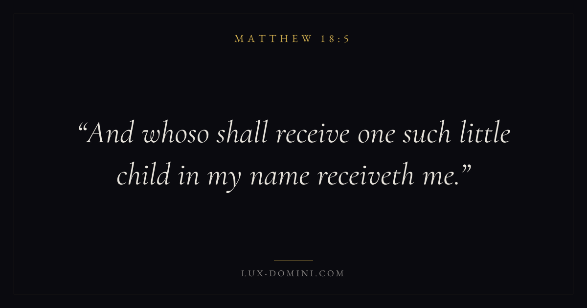 Books / Matthew / Chapter 18 / Verse 5 ← Matthew 18:4 Matthew 18:5 Matthew 18:6 → And whoso shall receive one such little child in my name receiveth me. Download verse card Share on Twitter Share on Facebook Pin it ✦ Key themes LoveFulfillmentKingdom of heavenDiscipleship Read with Matthew 18:4Matthew 18:6John 3:161 Corinthians 13:4 Related topics Bible verses about love ✦ Matthew Chapter 18 verses V. 1 V. 2 V. 3 V. 4 V. 5 V. 6 V. 7 V. 8 V. 9 V. 10 V. 11 V. 12 V. 13 V. 14 V. 15 V. 16 V. 17 V. 18 V. 19 V. 20 V. 21 V. 22 V. 23 V. 24 V. 25 V. 26 V. 27 V. 28 V. 29 V. 30 V. 31 V. 32 V. 33 V. 34 V. 35