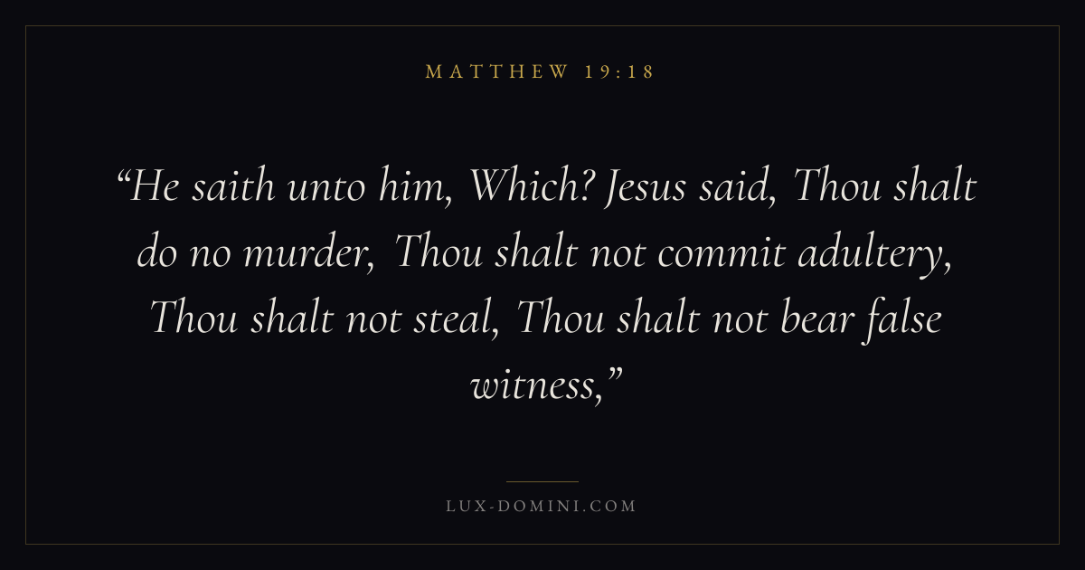 He saith unto him, Which? Jesus said, Thou shalt do no murder, Thou shalt not commit adultery, Thou shalt not steal, Thou shalt not bear false witness,