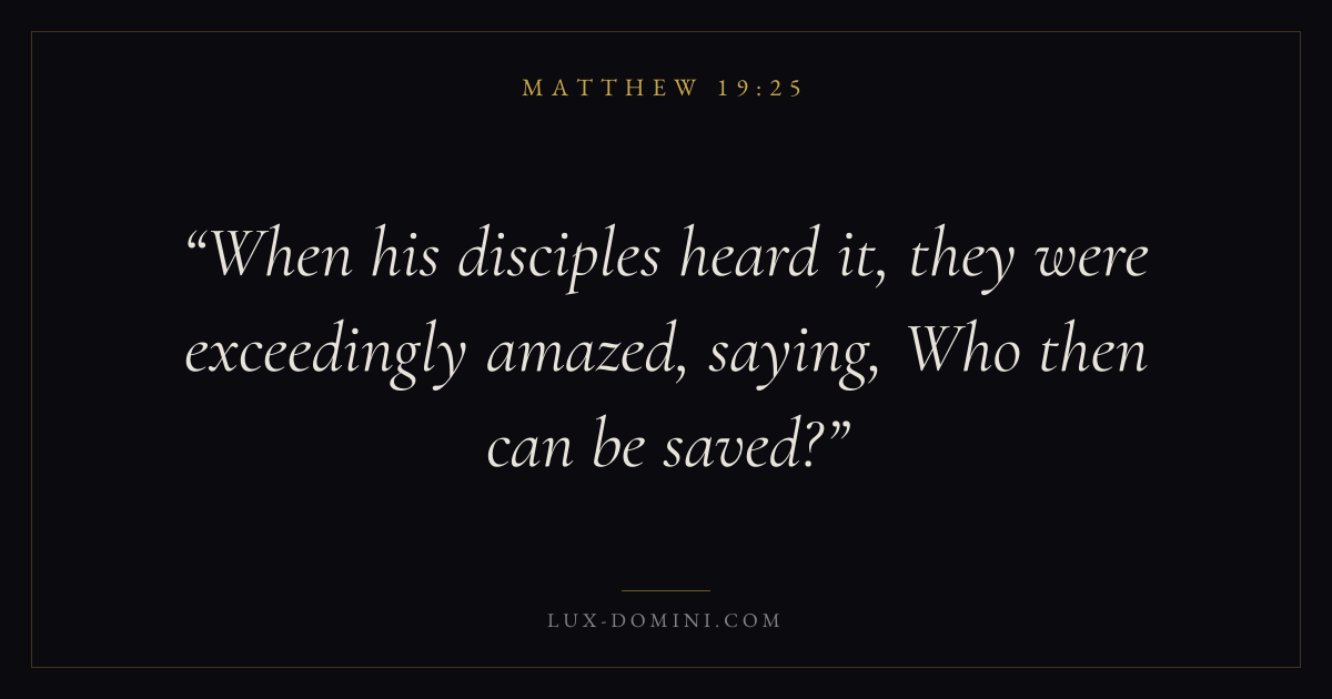 Books / Matthew / Chapter 19 / Verse 25 ← Matthew 19:24 Matthew 19:25 Matthew 19:26 → When his disciples heard it, they were exceedingly amazed, saying, Who then can be saved? Download verse card Share on Twitter Share on Facebook Pin it ✦ Key themes FaithJustice and mercySalvationFulfillment Read with Matthew 19:23Matthew 19:24Hebrews 11:1Romans 10:17 Related topics Bible verses about faithBible verses about justice and mercyBible verses about salvation ✦ Matthew Chapter 19 verses V. 1 V. 2 V. 3 V. 4 V. 5 V. 6 V. 7 V. 8 V. 9 V. 10 V. 11 V. 12 V. 13 V. 14 V. 15 V. 16 V. 17 V. 18 V. 19 V. 20 V. 21 V. 22 V. 23 V. 24 V. 25 V. 26 V. 27 V. 28 V. 29 V. 30