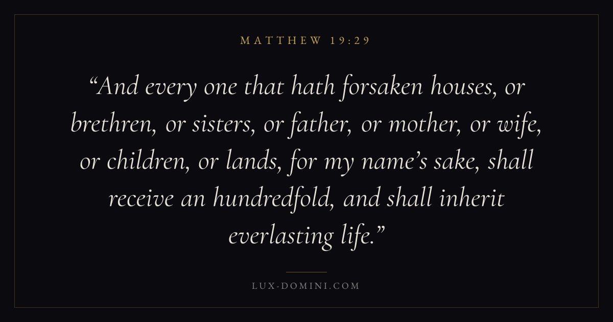 And every one that hath forsaken houses, or brethren, or sisters, or father, or mother, or wife, or children, or lands, for my name’s sake, shall receive an hundredfold, and shall inherit everlasting life.