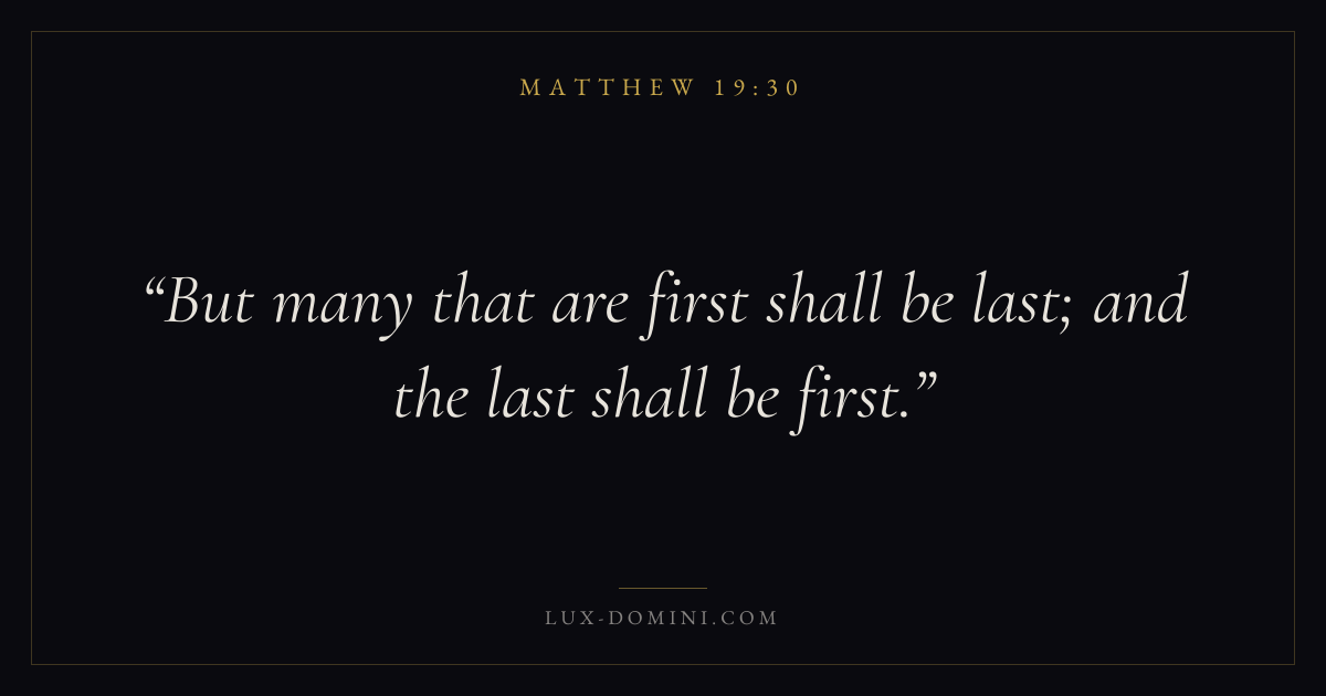 Books / Matthew / Chapter 19 / Verse 30 ← Matthew 19:29 Matthew 19:30 Matthew 20:1 → But many that are first shall be last; and the last shall be first. Download verse card Share on Twitter Share on Facebook Pin it ✦ Key themes FaithJustice and mercyFulfillmentKingdom of heaven Read with Matthew 19:27Matthew 19:28Hebrews 11:1Romans 10:17 Related topics Bible verses about faithBible verses about justice and mercy ✦ Matthew Chapter 19 verses V. 1 V. 2 V. 3 V. 4 V. 5 V. 6 V. 7 V. 8 V. 9 V. 10 V. 11 V. 12 V. 13 V. 14 V. 15 V. 16 V. 17 V. 18 V. 19 V. 20 V. 21 V. 22 V. 23 V. 24 V. 25 V. 26 V. 27 V. 28 V. 29 V. 30