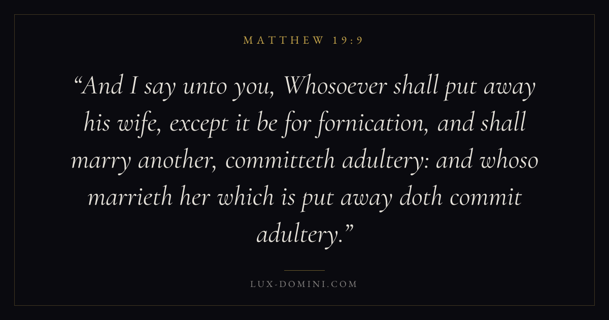 And I say unto you, Whosoever shall put away his wife, except it be for fornication, and shall marry another, committeth adultery: and whoso marrieth her which is put away doth commit adultery.