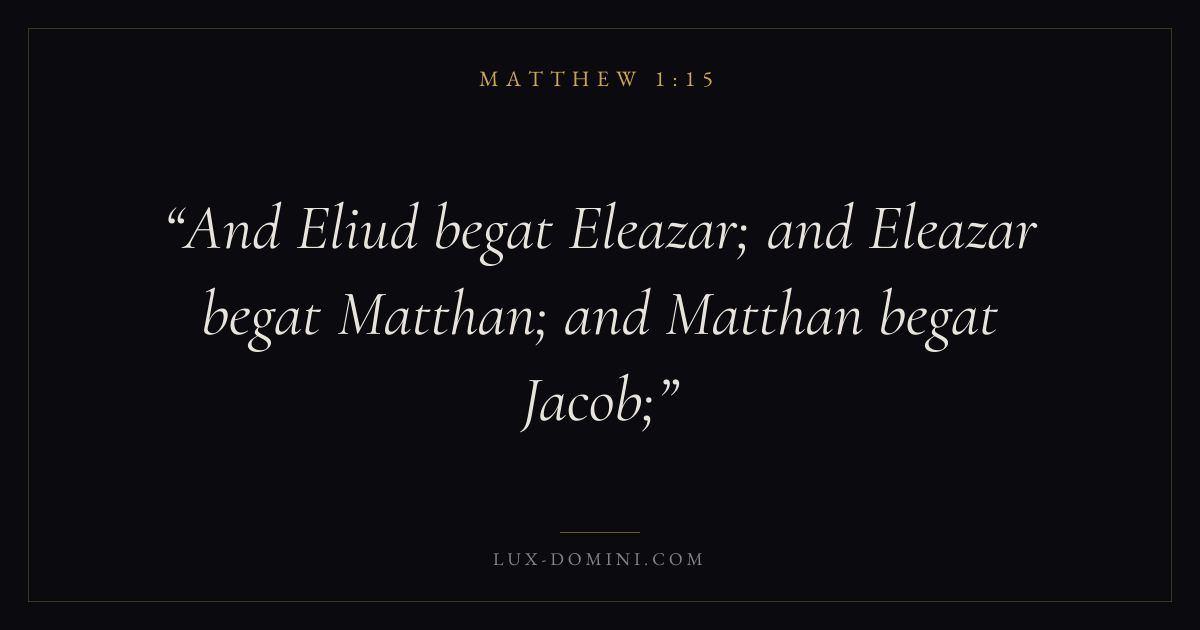 Books / Matthew / Chapter 1 / Verse 15 ← Matthew 1:14 Matthew 1:15 Matthew 1:16 → And Eliud begat Eleazar; and Eleazar begat Matthan; and Matthan begat Jacob; Download verse card Share on Twitter Share on Facebook Pin it ✦ Key themes FulfillmentKingdom of heavenDiscipleshipTeaching Read with Matthew 1:12Matthew 1:13 Glossary Eleazar Person God has helped. (1. ) The third son of Aaron ( Ex. 6:23 ). His wife, a daughter of Putiel, bore him Phinehas ( Ex. 6:25 ). After the death of Nadab and Abihu. ✦ Matthew Chapter 1 verses V. 1 V. 2 V. 3 V. 4 V. 5 V. 6 V. 7 V. 8 V. 9 V. 10 V. 11 V. 12 V. 13 V. 14 V. 15 V. 16 V. 17 V. 18 V. 19 V. 20 V. 21 V. 22 V. 23 V. 24 V. 25