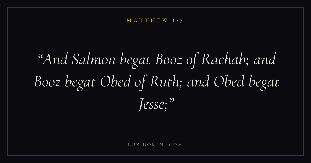 And Salmon begat Booz of Rachab; and Booz begat Obed of Ruth; and Obed begat Jesse;