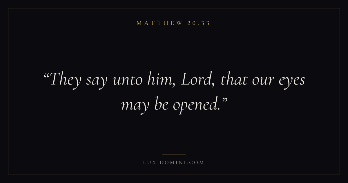 Books / Matthew / Chapter 20 / Verse 33 ← Matthew 20:32 Matthew 20:33 Matthew 20:34 → They say unto him, Lord, that our eyes may be opened. Download verse card Share on Twitter Share on Facebook Pin it ✦ Key themes Suffering and trialsPrayerJustice and mercyFulfillment Read with Matthew 20:30Matthew 20:31Romans 8:182 Corinthians 4:17 Related topics Bible verses about suffering and trialsBible verses about prayerBible verses about justice and mercy ✦ Matthew Chapter 20 verses V. 1 V. 2 V. 3 V. 4 V. 5 V. 6 V. 7 V. 8 V. 9 V. 10 V. 11 V. 12 V. 13 V. 14 V. 15 V. 16 V. 17 V. 18 V. 19 V. 20 V. 21 V. 22 V. 23 V. 24 V. 25 V. 26 V. 27 V. 28 V. 29 V. 30 V. 31 V. 32 V. 33 V. 34