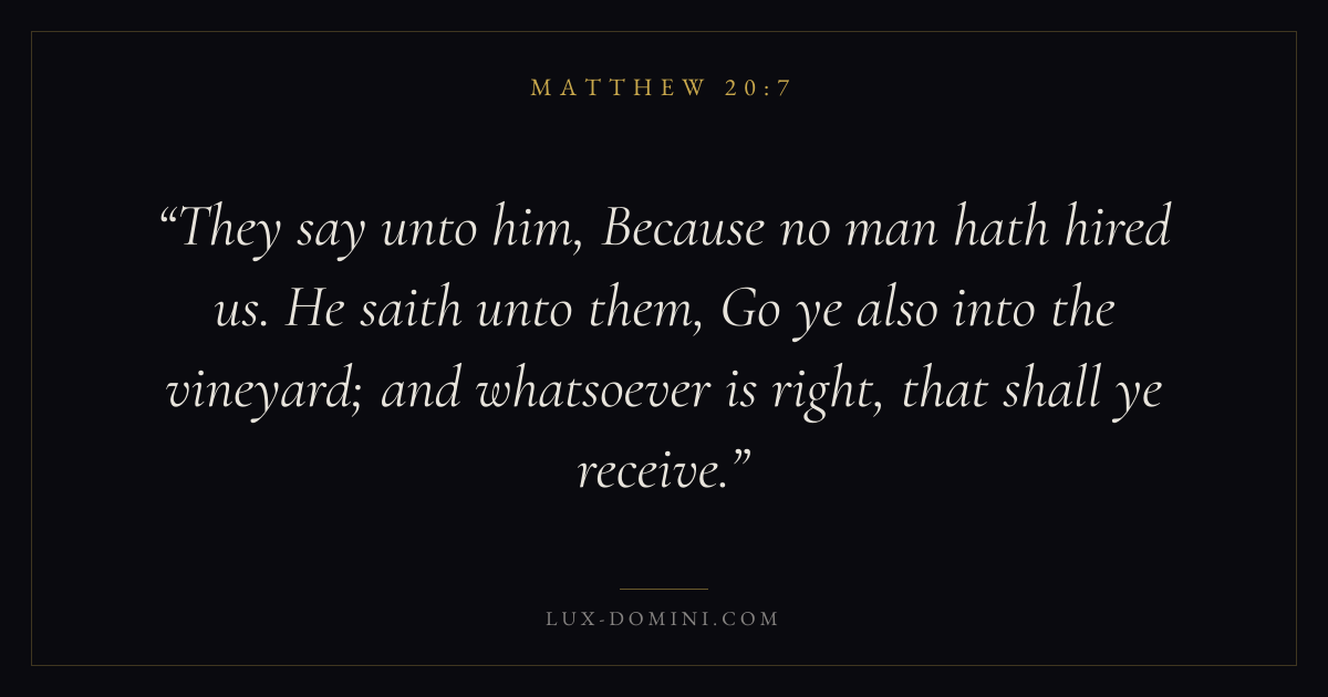 They say unto him, Because no man hath hired us. He saith unto them, Go ye also into the vineyard; and whatsoever is right, that shall ye receive.