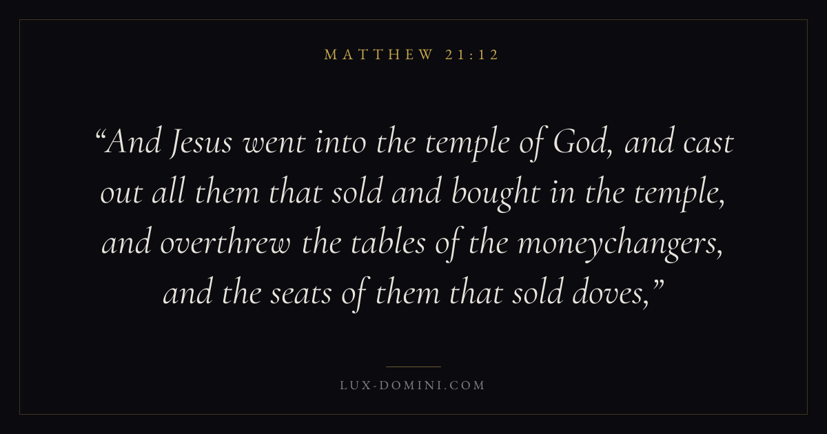 And Jesus went into the temple of God, and cast out all them that sold and bought in the temple, and overthrew the tables of the moneychangers, and the seats of them that sold doves,