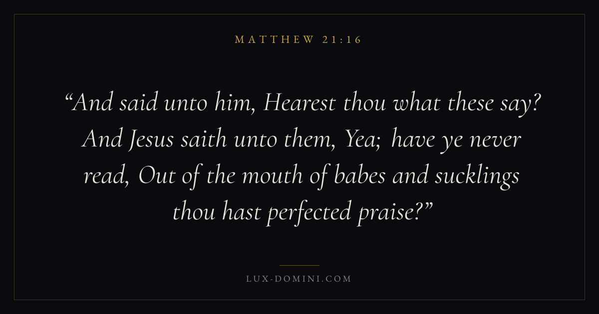 And said unto him, Hearest thou what these say? And Jesus saith unto them, Yea; have ye never read, Out of the mouth of babes and sucklings thou hast perfected praise?