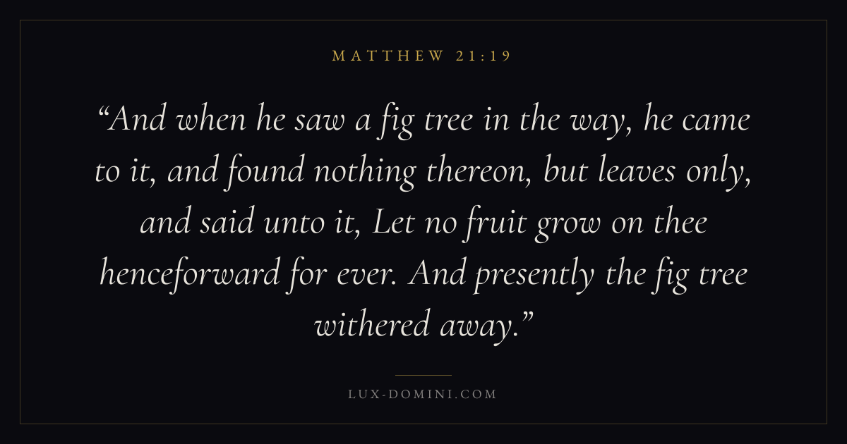 And when he saw a fig tree in the way, he came to it, and found nothing thereon, but leaves only, and said unto it, Let no fruit grow on thee henceforward for ever. And presently the fig tree withered away.