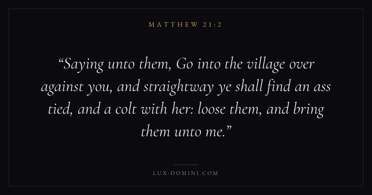 Saying unto them, Go into the village over against you, and straightway ye shall find an ass tied, and a colt with her: loose them, and bring them unto me.