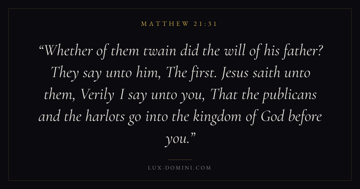 Whether of them twain did the will of his father? They say unto him, The first. Jesus saith unto them, Verily I say unto you, That the publicans and the harlots go into the kingdom of God before you.