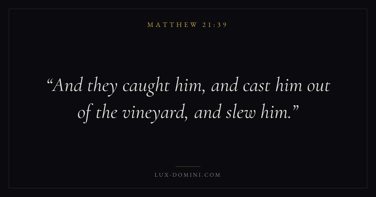 Books / Matthew / Chapter 21 / Verse 39 ← Matthew 21:38 Matthew 21:39 Matthew 21:40 → And they caught him, and cast him out of the vineyard, and slew him. Download verse card Share on Twitter Share on Facebook Pin it ✦ Key themes FulfillmentKingdom of heavenDiscipleshipTeaching Read with Matthew 21:36Matthew 21:37 ✦ Matthew Chapter 21 verses V. 1 V. 2 V. 3 V. 4 V. 5 V. 6 V. 7 V. 8 V. 9 V. 10 V. 11 V. 12 V. 13 V. 14 V. 15 V. 16 V. 17 V. 18 V. 19 V. 20 V. 21 V. 22 V. 23 V. 24 V. 25 V. 26 V. 27 V. 28 V. 29 V. 30 V. 31 V. 32 V. 33 V. 34 V. 35 V. 36 V. 37 V. 38 V. 39 V. 40 V. 41 V. 42 V. 43 V. 44 V. 45 V. 46