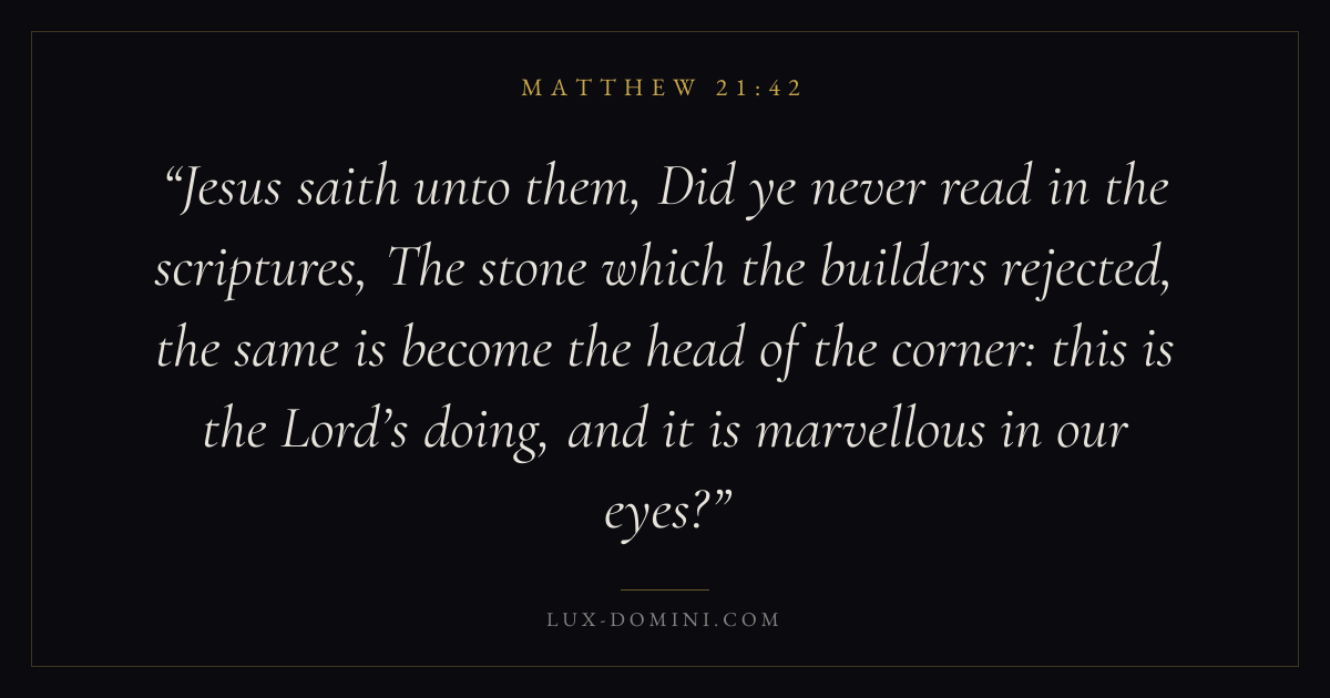 Jesus saith unto them, Did ye never read in the scriptures, The stone which the builders rejected, the same is become the head of the corner: this is the Lord’s doing, and it is marvellous in our eyes?