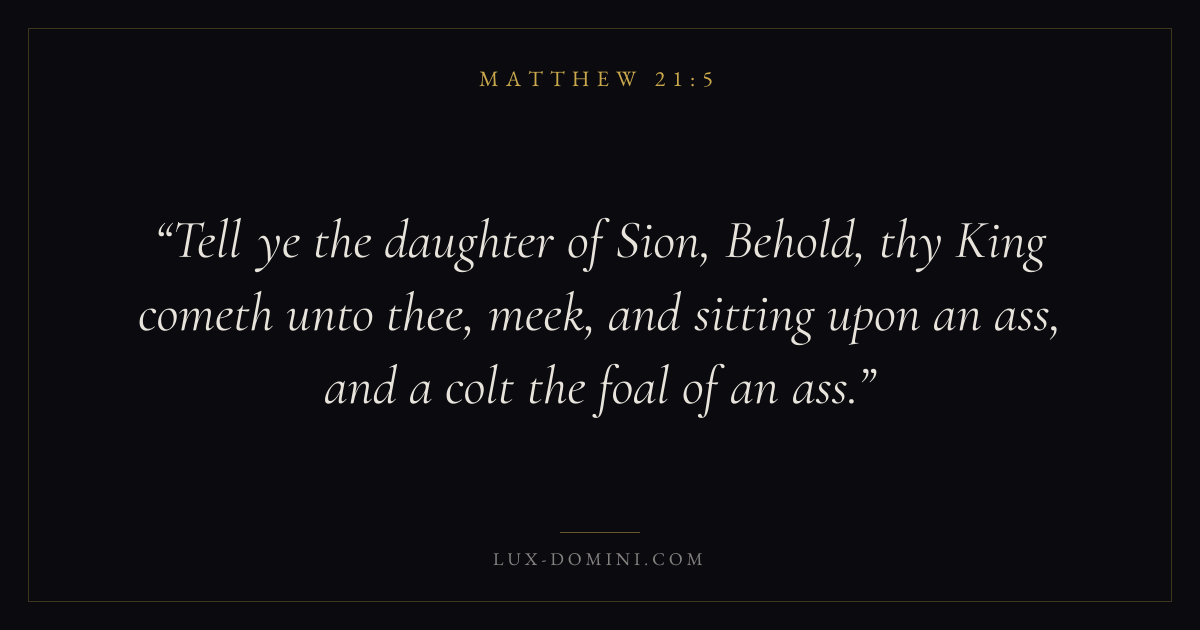 Tell ye the daughter of Sion, Behold, thy King cometh unto thee, meek, and sitting upon an ass, and a colt the foal of an ass.
