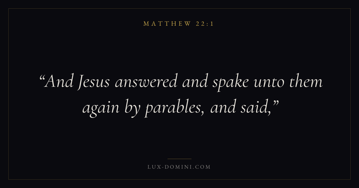 Books / Matthew / Chapter 22 / Verse 1 ← Matthew 21:46 Matthew 22:1 Matthew 22:2 → And Jesus answered and spake unto them again by parables, and said, Download verse card Share on Twitter Share on Facebook Pin it ✦ Key themes Justice and mercyFulfillmentKingdom of heavenDiscipleship Read with Matthew 22:2Matthew 22:3Micah 6:8Amos 5:24 Related topics Bible verses about justice and mercy ✦ Matthew Chapter 22 verses V. 1 V. 2 V. 3 V. 4 V. 5 V. 6 V. 7 V. 8 V. 9 V. 10 V. 11 V. 12 V. 13 V. 14 V. 15 V. 16 V. 17 V. 18 V. 19 V. 20 V. 21 V. 22 V. 23 V. 24 V. 25 V. 26 V. 27 V. 28 V. 29 V. 30 V. 31 V. 32 V. 33 V. 34 V. 35 V. 36 V. 37 V. 38 V. 39 V. 40 V. 41 V. 42 V. 43 V. 44 V. 45 V. 46