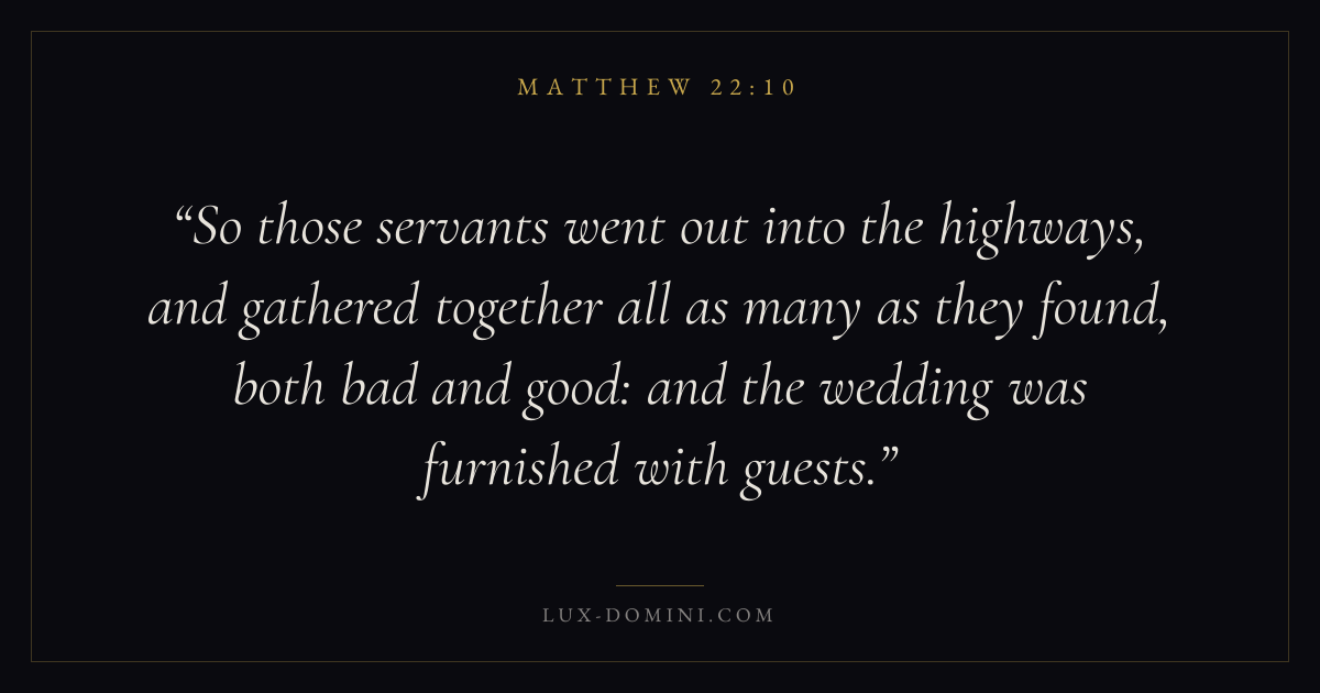 So those servants went out into the highways, and gathered together all as many as they found, both bad and good: and the wedding was furnished with guests.