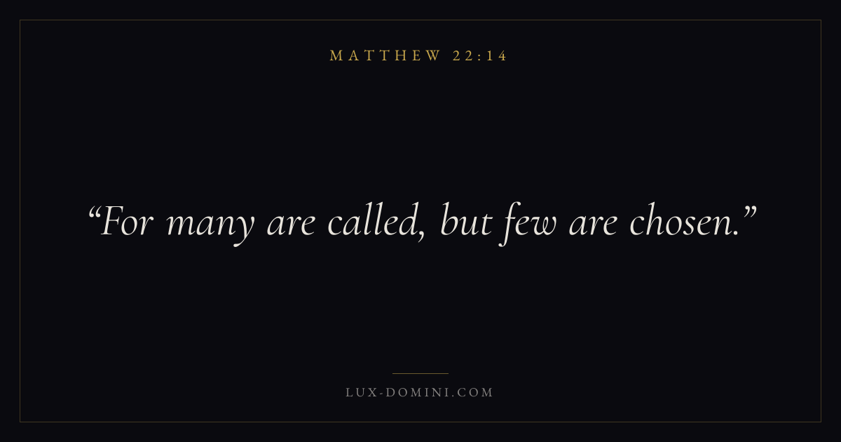 Books / Matthew / Chapter 22 / Verse 14 ← Matthew 22:13 Matthew 22:14 Matthew 22:15 → For many are called, but few are chosen. Download verse card Share on Twitter Share on Facebook Pin it ✦ Key themes Justice and mercyFulfillmentKingdom of heavenDiscipleship Read with Matthew 22:11Matthew 22:12Micah 6:8Amos 5:24 Related topics Bible verses about justice and mercy ✦ Matthew Chapter 22 verses V. 1 V. 2 V. 3 V. 4 V. 5 V. 6 V. 7 V. 8 V. 9 V. 10 V. 11 V. 12 V. 13 V. 14 V. 15 V. 16 V. 17 V. 18 V. 19 V. 20 V. 21 V. 22 V. 23 V. 24 V. 25 V. 26 V. 27 V. 28 V. 29 V. 30 V. 31 V. 32 V. 33 V. 34 V. 35 V. 36 V. 37 V. 38 V. 39 V. 40 V. 41 V. 42 V. 43 V. 44 V. 45 V. 46